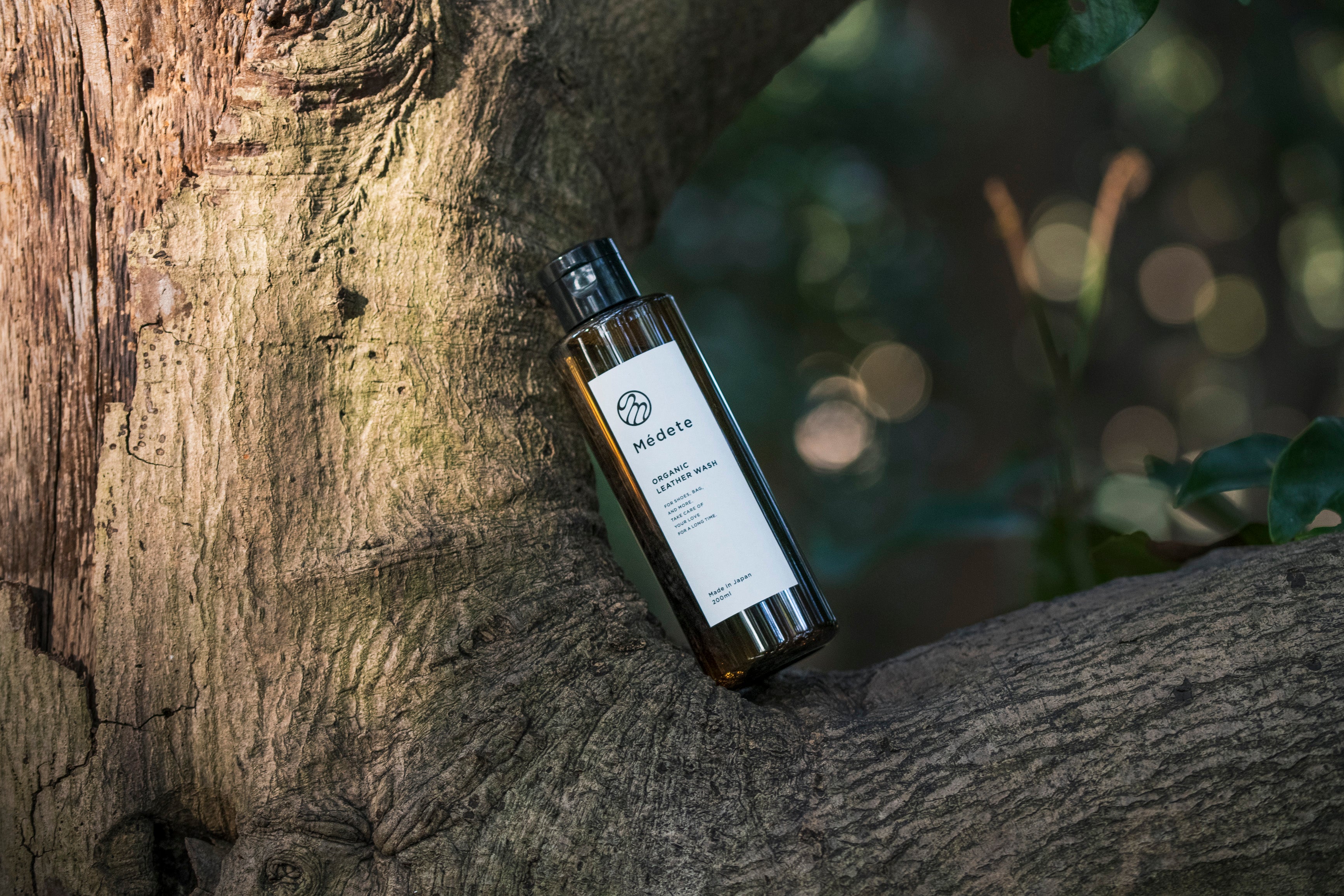 Médeteのオーガニックレザーウォッシュは、革製品の汚れを落とし、消臭・除菌してくれるだけでなく、風合いや質感を出し、そして日頃のお手入れとしてお使いいただくと皮革がゴワゴワになることを防ぐ効果もある、メーカーと共同で開発した「皮革用栄養洗剤」「皮革用美容液洗剤」です。本革でも、合皮でも、生地とのコンビでも、素材を選ばず使えるのも大きな魅力。